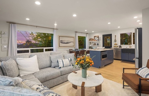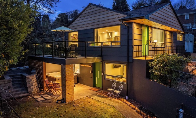 Experience the best that Tacoma, WA has to offer in this professional designed, newly renovated view home in Old Town. Views of the Puget Sound can be seen from every interior living space, deck, patio & spa. Complete privacy is provided with mature landscaping and green belt behind the home. Two kitchens, one on each floor and no stair entry to the lower unit. 1 loft style bedroom downstairs and two traditional bedrooms up, each furnished with quality beds and future. Here, you have it all. Watch the sunrise on the deck or while enjoying your morning coffee from inside. Views of the sound can bee seen from both floors. Throughout the day you'll see marine activity on the Puget Sound, enjoy natures surround with the green belt behind the home and soothing sunrises from both upstairs and down. Upstairs, the open living, dining and kitchen provide unobstructed views of the Puget Sound year round. Composite deck is accessible off of the upper kitchen/dining area. Downstairs you'll find the second living and dining room. Couch downstairs folds out to a hide-a-bed (memory foam mattress). Each space has seating arrangements to accommodate your party of up to 6.