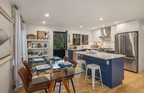 The main floor has an open design - living, dining and kitchen are one. The newly modernized kitchen has stainless steel GE appliances, Convectional gas stove and quality kitchen appliances, makes cooking here really enjoyable. Lower kitchen is also fully equipped with kitchen amenities and appliances. The cabinets here are original to the home (sold cedar wood) and have been modernized for easy use.