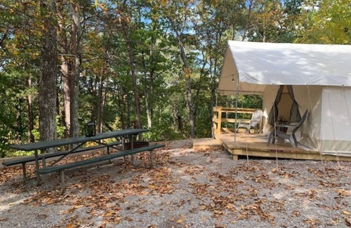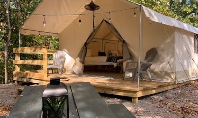 This 320 square ft tent is one of our larger Double Safari tents, with 7-ft back "porch" awning and a relaxing view, 2 ft. front "porch" awning, & 2 Queen beds. This spacious lot has a beautiful wooded view off the porch, and a larger area for grilling over the fire pit and eating outside. Enjoy your personal porch with a fresh brewed coffee from your Keurig Coffee maker, and a fridge for your snacks. The back porch is large enough to have your group's outdoor dinner cooked on the fire pit or rented grill, with a peaceful view of the wooded area behind it. Inside, cozy rugs, lamps, essential oil diffuser, and your own A/C & heating unit keep you comfortable in your outdoor home. Stay connected and charged with electrical outlets. Get outdoors and explore all that Cheaha has to offer, whether it's taking a dip in the lake or visiting stunning waterfalls and scenic overlooks with breathtaking views. Your family will never run out of things to do with 8+ hiking/biking trails, swimming, and enjoying all nature has to offer when you're at the highest point in the whole state. Glampsite will also include a fire pit with cooking grate, string lights, 2 Adirondack chairs, and a picnic table. This site can accommodate one of our Dinner Gazebos for an additional treat! **Should you have an additional child above the max, please use the mattress add-on to accommodate them - 1 max.**