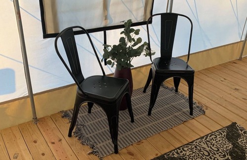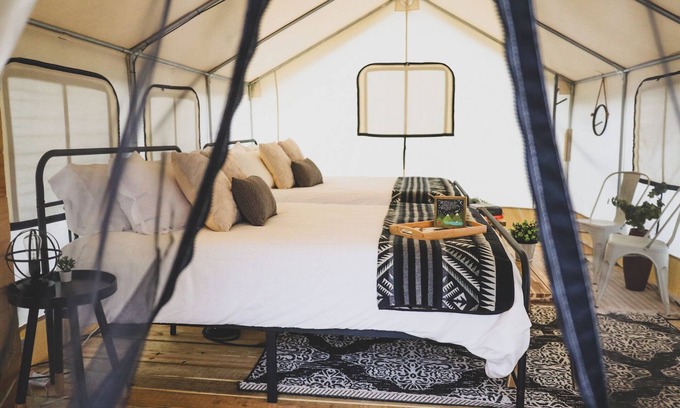 VIRTUAL WALK THROUGH AVAILABLE ON YOUTUBE. This 240 sq ft tent is incredibly comfortable and spacious, with 5 ft. front "porch" awning & 2 Queen beds. Enjoy your personal porch with a fresh brewed coffee from your Keurig Coffee maker, and a fridge for your snacks. Inside, cozy rugs, lamps, essential oil diffuser, and your own A/C & heating unit keep you comfortable in your outdoor home. Stay connected and charged with electrical outlets. Get outdoors and explore all that Cheaha has to offer, whether it's taking a dip in the lake or visiting stunning waterfalls and scenic overlooks with breathtaking views. Your family will never run out of things to do with 8+ hiking/biking trails, swimming, and enjoying all nature has to offer when you're at the highest point in the whole state. Glampsite will also include a fire pit with cooking grate, hammock, string lights, 2 Adirondack chairs, and a picnic table. **Should you have an additional child above the max, please use the mattress add-on to accommodate them - 1 max.**