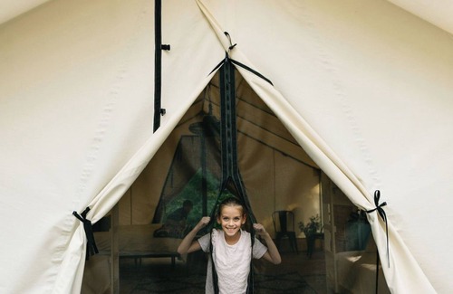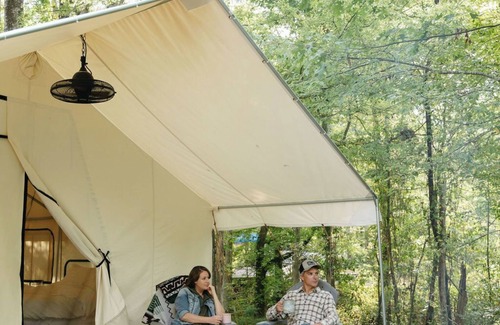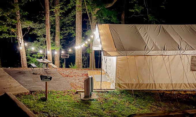 This 400 sq ft Deluxe Tent is incredibly comfortable and spacious, semi-private with 7-ft back "porch" awning and a relaxing, wooded view, plus a 2 ft. front "porch" awning, 1 king bed, and 2 sets of bunk beds. Enjoy your personal porch with a fresh brewed coffee from your Keurig Coffee maker, and a fridge for your snacks. The back porch is large enough to have your group's outdoor dinner cooked on the fire pit or rented grill, with privacy and a peaceful view of the wooded area behind it. Inside, cozy rugs, lamps, essential oil diffuser, and your own A/C & heating unit keep you comfortable in your outdoor home. Stay connected and charged with electrical outlets. Get outdoors and explore all that Cheaha has to offer, whether it's taking a dip in the lake or visiting stunning waterfalls and scenic overlooks with breathtaking views. Your family will never run out of things to do with 8+ hiking/biking trails, swimming, and enjoying all nature has to offer when you're at the highest point in the whole state. Glampsite will also include a fire pit with cooking grate, string lights, 2 Adirondack chairs, and a picnic table. **Should you have an additional child above the max, please use the mattress add-on to accommodate them - 2 max.**