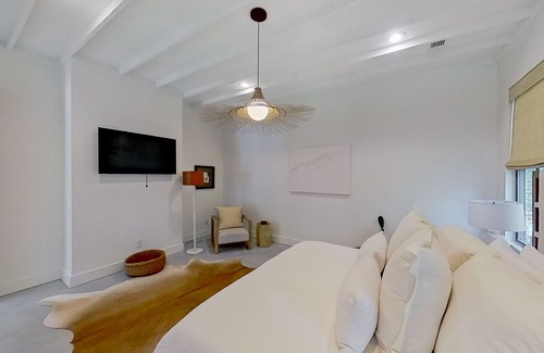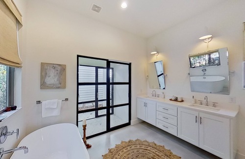 As you explore the rest of the home, you will discover four bedrooms, five bathrooms, a separate laundry room, and a designated office space. Equally inviting, the bedrooms come adorned with soft linens, bohemian-styled decorations, and central air. The bathrooms boast respective walk-in showers and soaking tubs.