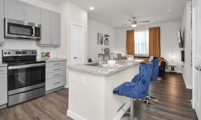 Our luxurious home is complete with high-end finishes. The living room welcomes velvet furnishing with a 58” smart TV programmed with streaming apps. We hope you appreciate the complimentary wifi. The bedroom includes a King bed with a 42” smart TV. An air mattress is available in the laundry closet, if needed.