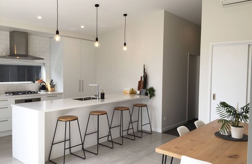 Our home is a super clean, minimal, contemporary designed, new home, with open plan living, high ceilings and an indoor-outdoor flow.