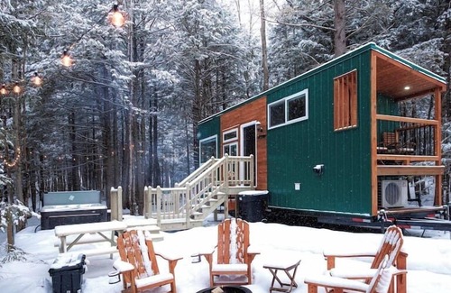 Luxury “IRIS Tiny Home” Getaway @ Green House Getaways is located just 5 miles from Loon Mountain and some of the best hiking trails in New Hampshire. Private amenities include salt water hot tub as well as a breeo smokeless fire pit/grille. After 18 months of construction we are finally accepting booking requests for our three identical Tiny Homes. We would love to have you stay with us!
