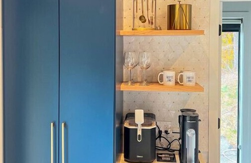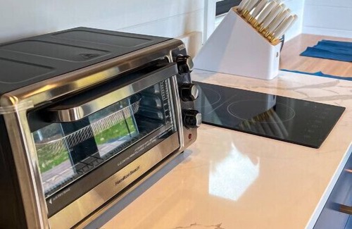 The kitchen includes a mini-fridge with small freezer space, a two-burner hot top, dishwasher, coffee/latte maker, and ice maker. The kitchen is fully stocked with glassware, utensils, barware, paper products, cleaning supplies, and your basic cooking ingredients (olive oil, S/P, coffee, sugar.)