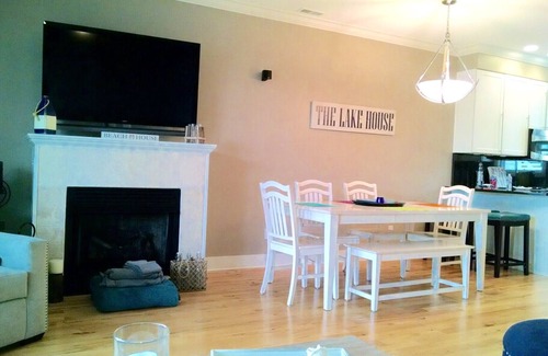 This newly furnished townhome has three bedrooms and two and a half bathrooms, including a master suite with king bed, a second bedroom with a queen bed, and a third bedroom with two twin beds. Each bedroom has a mounted tv with cable, and the townhome includes Wi-Fi.
