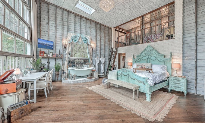 Guests also have exclusive access to the expansive yard space and fire pit area in front of the treehouse. Lay on the king size swing bed under the house and gaze up at a painted mural of rainbow row, or enjoy the large front yard and smores or drinks by the fire pit area.