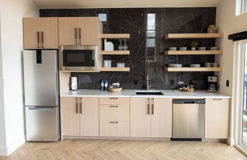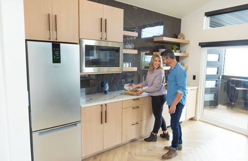 Recharge in the lavish king-sized bed and effortlessly lower the blinds at night with the touch of a remote. Refresh in the spa-inspired bathroom with a deep soaker tub for two, creating the perfect relaxing atmosphere. While the treehouse has dining essentials, including a fridge, microwave, coffee maker, and dishwasher, it does not feature a stove or oven for cooking.