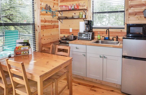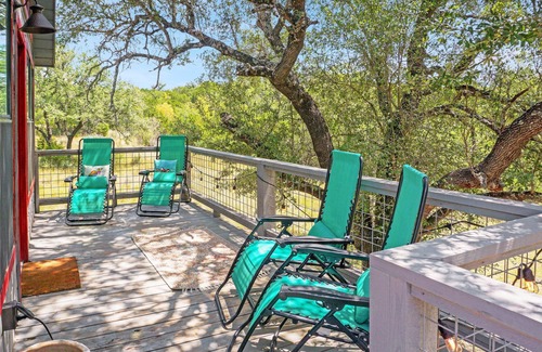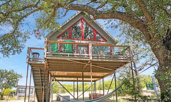 Fly away to the Finch House. This fantastic elevated Dripping Springs treehouse is the ideal choice for up to five guests looking for a weekend getaway. In this luxury bunkhouse, you'll feel as if you are sleeping in the trees tucked into a cozy and well-appointed nest! Luxury camping here means days full of exploring the fabulous countryside as well as entertaining day trips in the area.