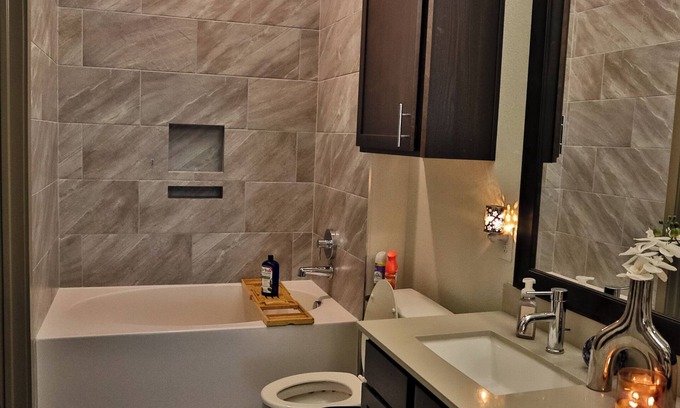 Your cozy getaway awaits in Houston at this luxury apartment. With a bedroom featuring a tremendous king bed and a bathroom equipped with a relaxing bathtub, guests will feel right at home. Enjoy the convenience of amenities like AC, a washing machine, and WiFi during your stay. It's easy to see why you'll be able to unwind at our place.