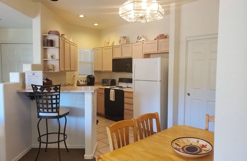The open kitchen/dining area and 9 foot ceilings throughout create a feeling of space and openness. Carpet and ceramic tile floors. Can sleep up to 4 comfortably with a king and 2 twin-size beds (or 5 with pull-out sofa bed).