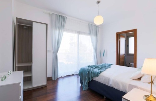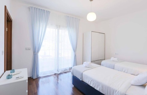 3 rooms are on the top floor, 1 room is on the ground floor and 1 room is on the bottom floor. All of our 5 rooms have air conditioning and en-suite bathrooms. There are 5 bathrooms and 1 toilet in total. The master bathroom includes a jacuzzi tub. Total bed capacity is 14 people. There is a baby bed. Our beds are ergonomic and of high quality. You can rest easy about their cleaning and comfort. 3 rooms have balconies and each balcony has a balcony table/seating set. Two of the balconies have a view of the sea and the marina, and the other has a view of the green area.