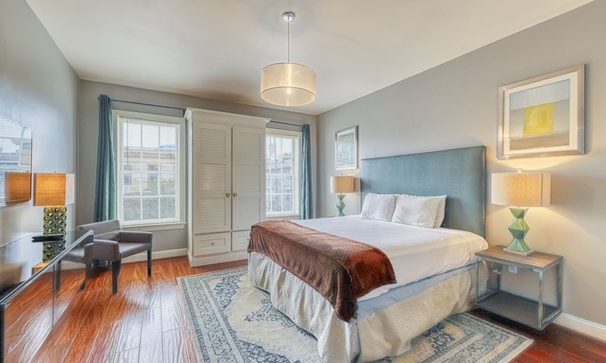 Planning a Savannah getaway with your large group? Consider booking this gorgeous four-bedroom dwelling, which boasts an unbeatable location and luxurious amenities such as private en suite bathrooms and TVs in each room. Guests interested in exploring historic Savannah on foot will find no better home base than this. Just four blocks from Forsyth Park and one mile from downtown, this home provides easy access to museums, art galleries, restaurants, and retail.