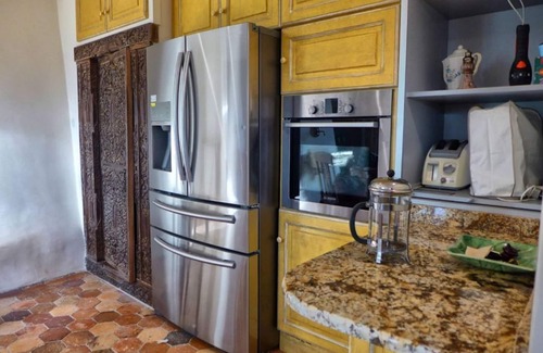 The Provencal-style kitchen is built around a fireplace and an original ancient stone basin. This is an oasis for the best of cooks, with a professional gas cook-top, three ovens, two dishwashers, a new French-door refrigerator, an under counter refrigerator in the island, a freezer, microwave oven, and coffee maker. Spacious granite counters cover the cabinets and the island, which seats four. There is also a round teak table that seats six sits in front of the fireplace, near the arch to the dining room with an ebony table for 12.