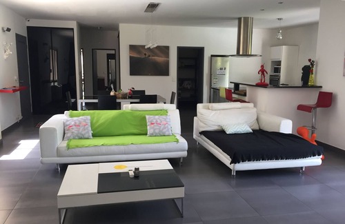 It consists of a large living room of 60m2 with a living room opening onto the garden of 1200 m2, (flat screen TV 130cm, DVD, playstation, bluetooth speaker). Fully equipped kitchen "fridge, freezer with drawers, induction hob, NEF oven, steamer, dishwasher, microwave, Nespresso machine, toaster, food processor, plancha, wok, juicer. to eat for 8 people. A cellar laundry composed of cupboards of arrangement, washing machine, central steam. 4 bedrooms (2 beds 160, 1 bed 140, 1 sofa bed permanent bed 140 cm), linen provided (bed linen, hair towel, bath towels, beach fouta, tea towel), 1 dressing room, cupboards murals in each room, 1 bathroom and 1 shower room with Italian shower and 2 WC including a separate. 1 office with printer and scanner, elliptical trainer. Centralized aspiration and air conditioning heat pump.