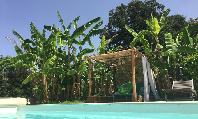 Enclosed garden of 1200 m2 with swimming pool salt heated heat pump 4X8m lit at night, summer kitchen consisting of a barbecue, a pizza oven and a counter. an outdoor lounge by the pool. A petanque court with loan of balls. 3 terraces, one covered. table and chairs in the garden. Several sunbathing. Hammock and swing. Private parking.