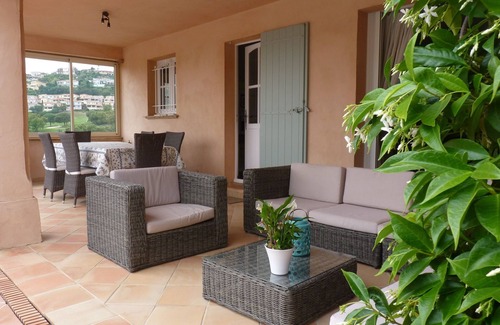 comfortable villa located in a quiet residential area with private pool, view over the golf course beautiful view of Ste Maxime, 1 km from the beaches and the town center, 18 hole golf course 1 km, 15 km from St Tropez, 1 km from the sea