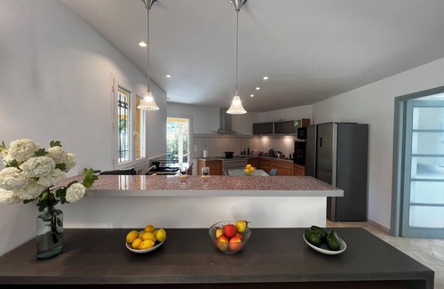 >A fully equipped open-plan kitchen perfect for preparing and sharing meals (stove, oven, microwave, American fridge, dishwasher, Nespresso coffee machine...)