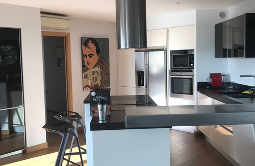 Modern stone house with all comforts and large teak terraces, comtemporary furniture, fully air-conditioned with beautiful sea and pool view mirror .Située on a hill overlooking the Gulf of Valinco. Shops and supermarket nearby.