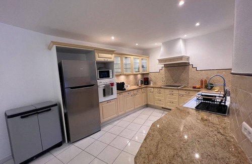 Fully equipped kitchen with fridge-freezer, dishwasher, oven, microwave, Nespresso & filter coffee machines, hob, toaster, cookware, and basic condiments (oil, salt, pepper)