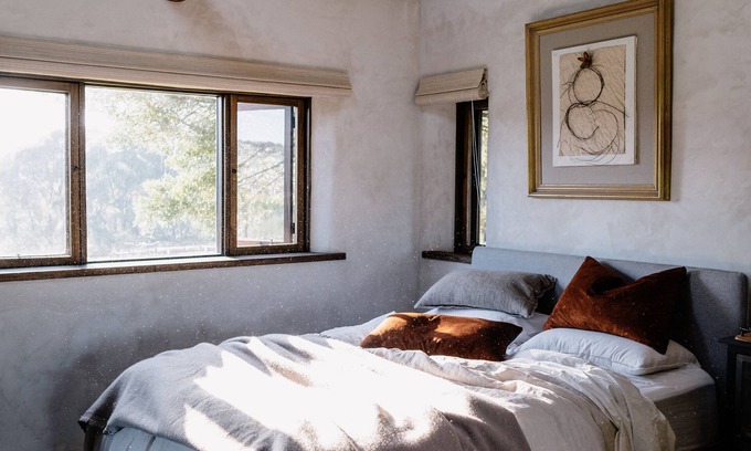 Carl's hut discretely blends the old and the new, with heated polished concrete floors, vaulted ceiling, skylights, original timber beams, lime-washed walls, a bedroom with forest views and bathroom with a floor-to-ceiling window overlooking the vines.