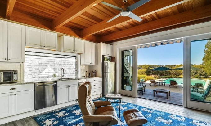 Invite the extended family to stay in the adorable, detached pool/guest house with a combo living room/kitchen, another large deck with awning expand entertainment options. Inside is a full bathroom on lower level, with a bright 2nd floor open sitting area, queen bed and views of the bay and pool. The kitchen has an under counter ice maker, full size refrigerator, microwave, dishwasher, hot plate and ample cabinet space. A large window opens to the outside bar with seating for 4.