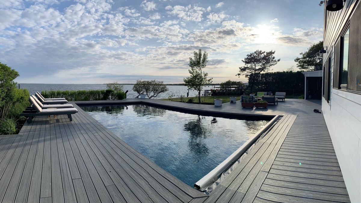 Enjoy spectacular waterfront living on a picturesque property with a heated pool overlooking Moriches Bay and Fire Island views. Wake up to breakfast watching the sunrise over Moriches Bay from inside the cozy screened in porch or outside on the lovely poolside deck or from the private bulkhead boardwalk. Spend the rest of the day lounging in the heated pool overlooking amazing views, fishing, clamming, kayaking or paddle boarding right in the bay in the backyard. There are 2 bedrooms on the 2nd floor and 2 on the 1st floor. The two bedrooms on the second floor have double beds and spectacular views of the Bay. These two bedrooms share a bathroom. The first floor has a waterfront bedroom with a double bed, and the 2nd bedroom has 2 double beds. These two bedrooms share a bathroom in the first floor. All bathrooms are newly renovated. The living area is an open layout design with panoramic views of the bay. High end kitchen with a peninsula island and seating for 4 people. The Dining table seats 10 comfortably. Large exquisite decorated living room with a TV seating area off the living room. Beautifully decorated cozy screen in porch with a daybed for afternoon naps. Large heated pool with 4 lounge chairs and 3 umbrellas and an outdoor shower. Huge deck with comfortable seating to enjoy the views and good conversation. 100 foot bulkhead walkway with a sand area , chairs and a fire pit to enjoy roasting marshmallows, enjoy the sunset and watch the beautiful sky while watching the stars. Or just enjoy drinking coffee in the mornings and the serenity of the area. Webby Beach is just 150 feet away, just past 2 neighbors. Tanger outlets, Splish Splash Water park and Westhampton town are all within a 15/20 minute drive. Wineries are a 20-25 minute drive. Local bars and restaurants are close by. Ocean beaches are a 15 min. drive to the west (Smith Point) and to the east (Westhampton). The street borders a 263 acre park with trails. A thoughtful visitor's guide which provides a comprehensive list of activities, lesser known wineries and favorite restaurants is available to help you plan your stay.