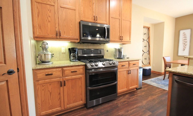 Luxury, comfort and great views are what you will find in this home. Located only 5 miles from Mayo Clinic in a safe and quiet neighborhood. Room and Board furniture and bedding throughout. Recline on the leather sofa while watching TV or enjoying the fireplace. The main floor master en suite features a king-size Sleep Number bed with sateen linens. The bathroom has a new jetted tub & a large glass walk-in shower. 2 queen sized bedrooms are also located on the main floor. Do some work in the large office in the sun room or relax in the Ekornes Stressless chair. Enjoy cooking your meals in our fully equipped granite kitchen. Dine in the large dining room or on the furnished deck overlooking a beautiful backyard. The lower level has two large queen-sized bedrooms and a full bathroom. Cozy up in front of our large stone fireplace and comfortable sectional seating. Get yourself moving on the treadmill or enjoy some yoga. This place is perfect for couples, families or business executives.