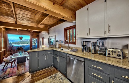 The top floor showcases the glorious private primary suite with a spa-inspired bathroom. Lake views abound, even from your king bed or while you shower. The main living level is open concept with 30' vaulted ceilings and panoramic views of Zephyr Cove and beyond. Here you'll find the kitchen, laundry, half bath, and living & dining rooms, each with its own deck - including an outdoor bistro seating, gas grill, and hammock. The living room provides plenty of seating and entertainment, including a leather sectional, 65" 4K TV, Bose speaker, Blu-ray player, and gaming system. On this level, we also provide a small fenced-in area for your pups. The lower level has the remaining 2-bedrooms, 1 full bath, and a dry sauna. Each bedroom opens onto private decks. One features a queen bed, and the second with two twins. All bedrooms are equipped with HDTVs and Apple TV's. There is a queen air mattress available for additional sleeping options.
