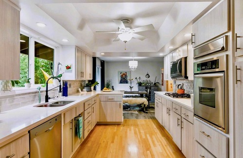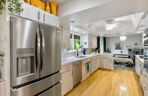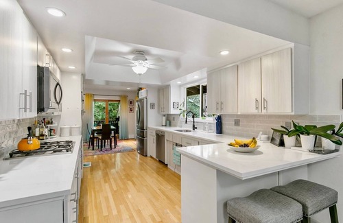 Modern Amenities: Remodeled kitchen with quartz countertops, stainless steel appliances, and central A/C that is rare in Tahoe.