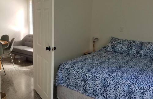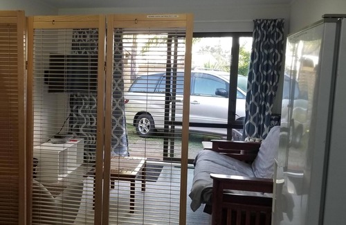 Great romantic hideaway for couples and small families. Has a small half bach stove Microwave, Covered Frypan, Outdoor Oven-BBQ- Grill , Large new 2 person shower and good HW. However may not be suitable for everyone . Has a romantic Kiwi charm, and style and is excellent value. Two bedrooms - Bedroom one- queen bed- Bedroom two - two king single bunks plus 1 queen futon /sofa bed in screened lounge area. Shady deck, teak outdoor furniture, hammock & BBQ.