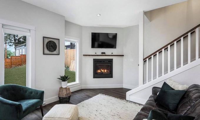 The Machleary Hideaway is a place you can call home away from home. Designed to accommodate, couples, families, business people, or a space for friends to just enjoy while they discovering Nanaimo Fully furnished, featuring a gas fireplace, big tv, Bluetooth sound speaker, charging stations, full kitchen, two bedrooms, two bathrooms, office space with a harbour view. The decor is simple, clean and tidy. Over height ceilings give the place an open and airy feel.