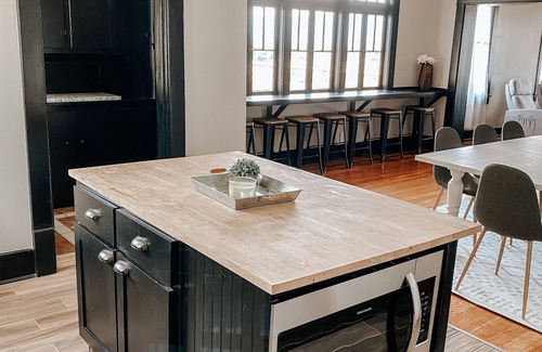 Kitchen space is ideal for those guests looking to cook for themselves during their stay. Kitchen includes a butcher block island, an original butler's pantry, and farmhouse sink.
