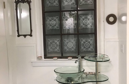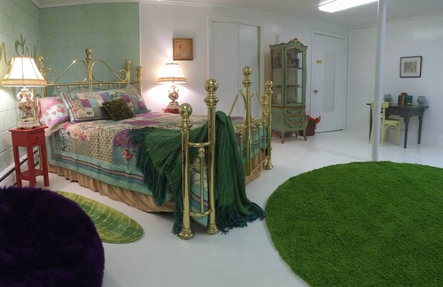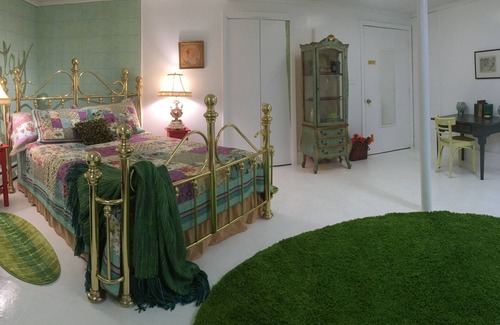 The cemetery that surrounds this Craftsmen 4 room School House is located in the midst of one of the most gorgeous historic cemeteries in all of America, & a short 7 minute walk to the Town square. This is the basement of our Old Cemetery Schoolhouse. You will have private entry & access to a bedroom, bathroom, laundry room and TV room, all private..