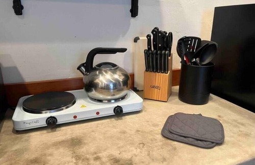 The living room has a 42” Roku TV and seating for 5 with extra chairs in the alcove. The kitchen has a refrigerator with freezer, tabletop stove/hot plate with 2 burners, toaster oven, coffeemaker, cookbooks for both the toaster-oven and microwave, pantry essentials, pots and pans, and more--everything you need to get cooking!