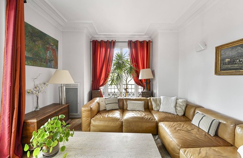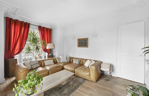 Boasting gorgeous wood flooring, vibrant red curtains and windows that look out to the Église Saint-Sulpice church, this living room is an ode to the finer things in life. A large, luscious leather sofa sits ready to welcome you in after a busy day, and a vintage mirror brings a touch of sophistication.