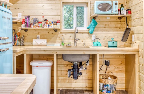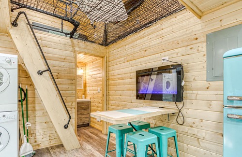 Spread across two floors, the sparkling interior is appointed with fun accents like skylights, an electric fireplace, and a unique indoor hammock. Whip up delicious dishes in the retro-chic kitchenette, complete with a sink, coffee maker, full-size fridge, microwave, toaster oven, and electric cooktop. After fun-filled days of exploration, enjoy a relaxing rinse in your outdoor tub/shower!