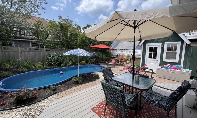 Please note, when requesting dates, our turnover day is Friday, not Saturday. Please read entire description for important information regarding cancellations. Oceanside Beach Haven Victorian, one block from the Beach, just steps from the heart of town on historic Engleside Avenue, across from the Surflight Theatre. Four bedrooms, 2 Baths, PLUS attached efficiency bedroom w/kitchenette and third (private) bath. Saltwater heated pool (heated after May 15 until October 15), newly remodeled kitchen, newly enlarged dining and living areas, bar, outdoor shower and half bath. Engleside Avenue is a lovely area, walking distance to shopping, restaurants, bars/clubs, mini-golf, pharmacy, Fantasy Island Amusement Park, Thundering Surf Water Park, Chicken or the Egg. This rental was formerly two adjoining 2 bedroom units with 2 small kitchens and 2 small living rooms, with a separate rented efficiency. Upon receiving suggestions from our guests, we have opened up, combined, enlarged and remodeled these units to accommodate larger family groups in the living areas.