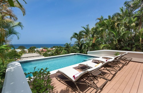 Built in 2006 this beautiful 4 bedroom, 4 bathroom villa is our family holiday home. Its prime location on the ridge takes advantage of the magnificent uninterrupted views out to sea whilst still being close enough to be within walking distance of the local beach and facilities. The stunning views are beautiful by day and in the evening the outside areas are fabulous for al fresco dining/BBQ or simply sit under the stars with a glass of wine and watch the cruise ships sail off into the distance. Our villa combines the luxury of Barbados with the comforts of home! A huge wooden deck leads from the house to the pool with gardens to all sides. The lounge area is split level with comfy sofas, armchairs and reading sofa. The entrance to the house has its own covered verandah for escaping the sun. The villa has TV, Bose Bluetooth speaker and a large stock of games and a small library. WIFI is available throughout the property and out on the deck/ pool area. Local telephone calls are free.