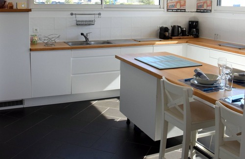 Fitted kitchen with 14m2 central island (4-burner induction hob and 4-seat extension), electric oven, fridge, microwave, dishwasher, coffee maker, electric kettle and toaster.