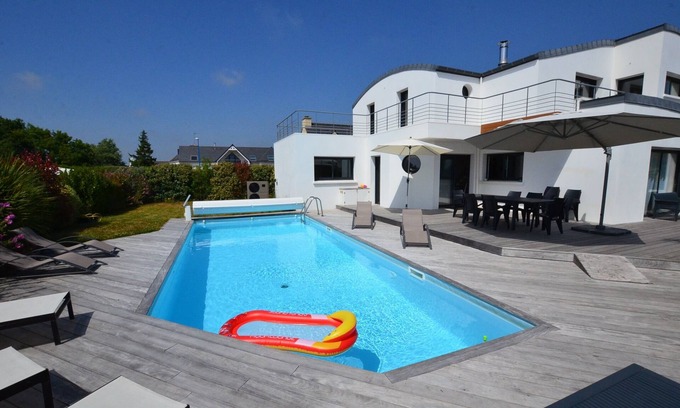 Villa Kéruster is a spacious villa of modern architecture of 210 m2 facing south. Classified furnished tourism 4 stars. This villa has a large ground floor space accessible to wheelchair users. It enjoys a pleasant light from morning to evening, with a sea view from the terrace of the rooms. From mid April, depending on the weather, you will benefit from a large heated swimming pool with counter-current swimming, a jacuzzi spa as well as a billiard table and an indoor outdoor ping pong table which complete the Hobbies.