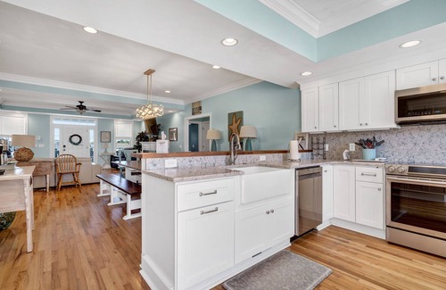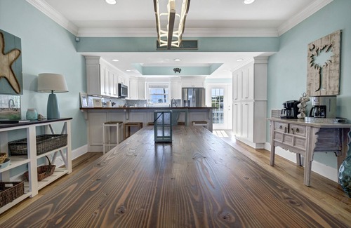 Do you like to cook on vacation? You won't be disappointed with our beautifully-appointed kitchen that overlooks the dining and family area so you can still be with your group! The sun deck located right off of the kitchen overlooks the swimming pool and volleyball court.