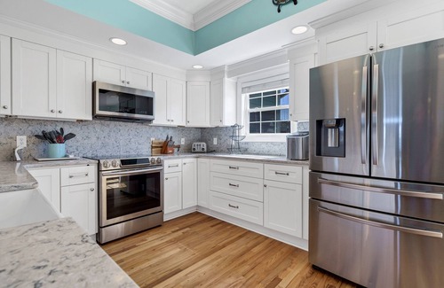 There are TWO large family gathering areas with large TV's to help make everyone happy! You can turn on the fireplace and relax in the first floor family room while others in your group enjoy the second floor family room. The second floor family room opens to the porch which offers views of the Atlantic Ocean - just a very short walk up the street.