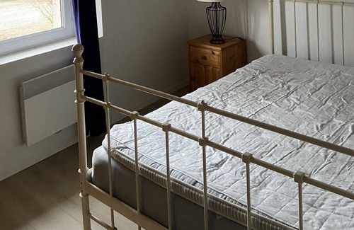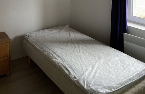 The kitchen is equipped with an oven, a stovetop, and a refrigerator, as well as an electric kettle, a microwave, and cookware. And there's a washing machine, so you can even pack a bit lighter. Other amenities include bed sheets, an ironing board, heating, and a dining table.