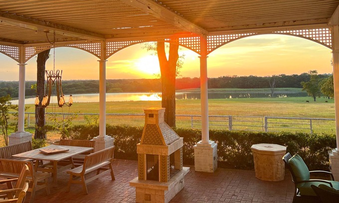 Our villa is a testament to elegance and tranquility. Each of the 5 master bedrooms features a private en-suite bathroom, ensuring utmost comfort and privacy for all guests. Step into the opulent great room, where you can relax and create lasting memories. The sun room and back patio offer panoramic views of rolling hills, a magnificent pond, and delightful livestock, including horses and majestic Texas longhorns. As the sun sets, marvel at the captivating sight that inspired the name of this magical place: "Pink Sky Ranch."