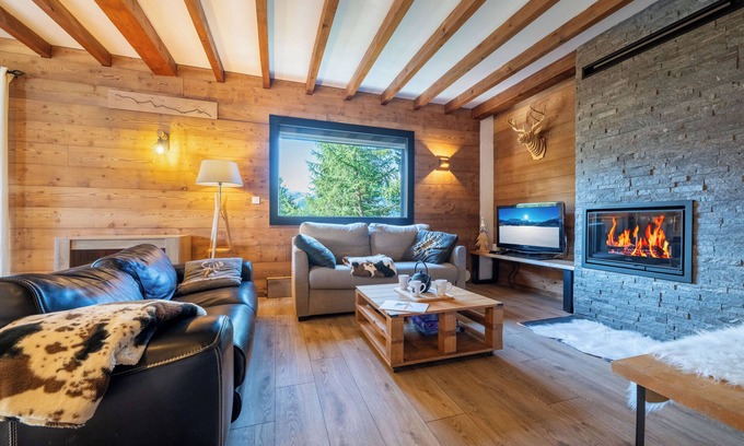 This apartment offers a large living room of 40 m², with fireplace (wood provided) dining area (table 10 people), living room with 2 sofa beds, bench and ottomans. Its south-facing exposure will ensure you enjoy optimal sunshine, from breakfast to sunset, and enjoy a panoramic view of the mountains.