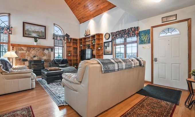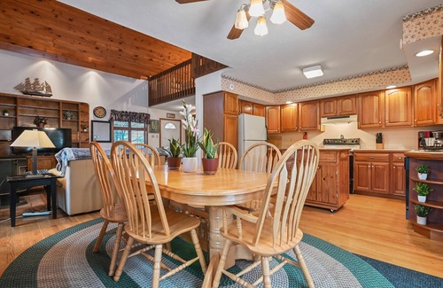 Back at this home away from home, you'll be in for a treat when you walk in through the door and find a wide and spacious living area, complete with furnishings for you and your friends to relax in. This vacation rental boasts a brilliant cabin-like aesthetic, from its various knickknacks to the paintings strung along the wall. Step into the full kitchen and whip up a delicious dinner for everyone, then gather around the dining room table and feast to your heart's content. Sit out on the deck and take in a breath of that fresh winter air as it fills your lungs. Afterward, head back in and gather around the living room and talk the night away with some good drinks and even better company. Zoned forced air and baseboard radiator heat ensure you and your guests will be comfortable, no matter the time of year. A full-service supermarket is a short drive away if you're in need of supplies.
