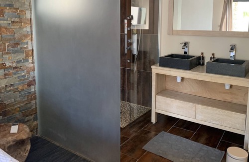 As you settle into the place, you'll find a living room, a BBQ grill, and air conditioning. Bathroom amenities include a hair dryer, towels, and toilet paper. The kitchen is equipped with an oven, a stovetop, and a refrigerator, as well as a coffee maker, an electric kettle, and a microwave. And because there's a washer and dryer, you can go a bit lighter on your packing.