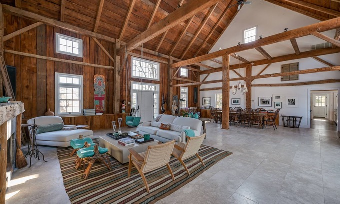 Wonderful opportunity to rent this original barn in Wainscott with farm views and ocean breezes. This 3-acre compound offers the main house with 4 bedrooms, 4 full baths, vaulted dining and living room with fireplace, open kitchen with breakfast nook, family room and fireplace, loft, master suite on second floor with doors leading out to a private deck, finished lower level with ping pong, gym, TV, game area and laundry room. The exterior of the property is professionally landscaped that includes a pond, heated pool, pool house, vegetable garden, detached 2 car garage and with a studio above. One can walk to the ocean, a stone's throw to a local farmer's market, and convenient to East Hampton and Bridgehampton.